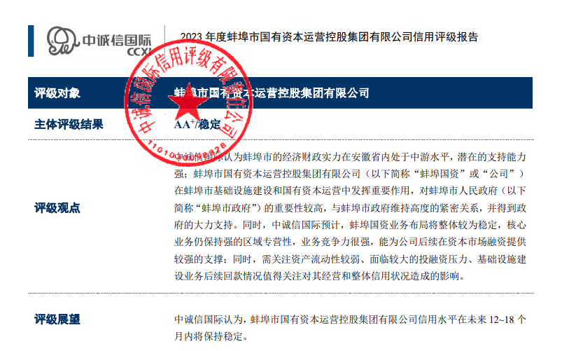 2023年9月4日,經(jīng)中誠信國際信用評(píng)級(jí)有限公司評(píng)定,蚌埠市國有資本運(yùn)營控股集團(tuán)有限公司再次成功獲評(píng)AA+主體信用評(píng)級(jí),評(píng)級(jí)展望為穩(wěn)定,時(shí)效期為一年。這是蚌埠國控集團(tuán)繼2022年8月5日獲得東方金誠國際信用評(píng)估有限公司評(píng)定的AA+主體信用評(píng)級(jí)后,再次評(píng)為AA+級(jí)信用主體,實(shí)現(xiàn)了AA+主體信用“雙評(píng)級(jí)”。